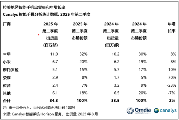 快科技9月3日消息,今日,市场调研机构Canalys发布2025年第二季度拉丁美洲智能手机市场出货量。