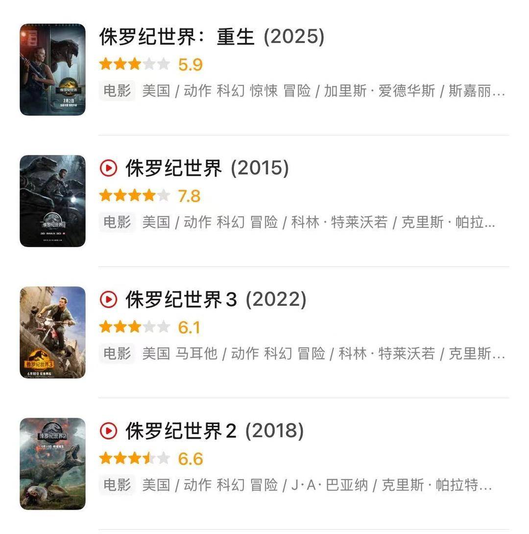 典型代表便是《侏罗纪世界》系列四部曲。从2015年到2025年,四部曲皆选在暑期档上映,有趣的是,四部的票房和口碑基本呈梯度下滑: